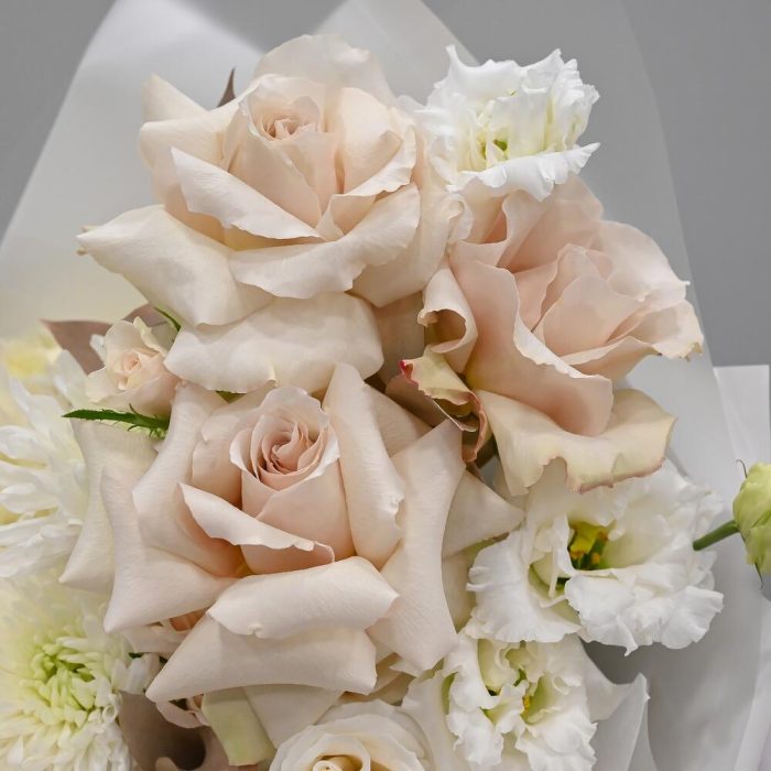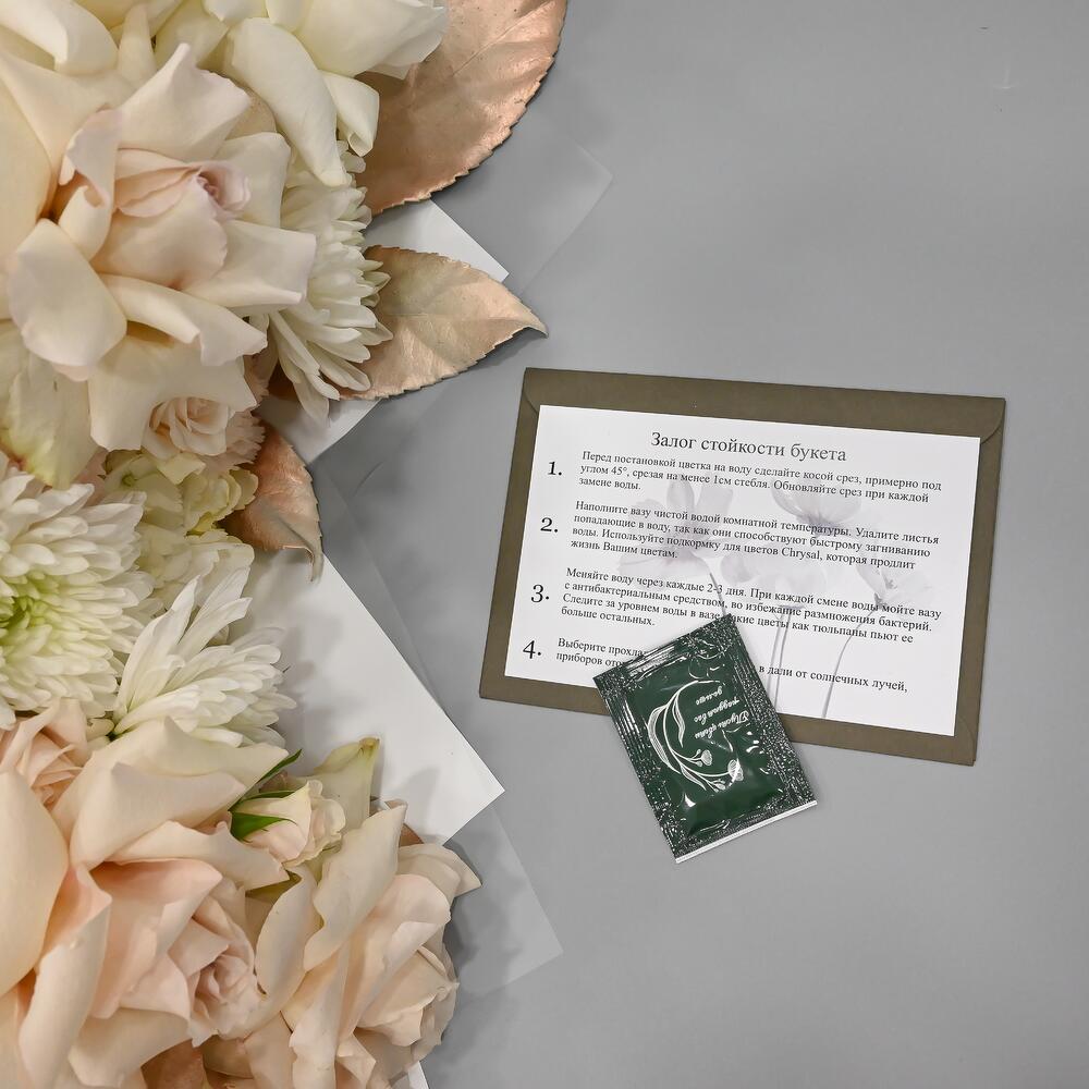 Роскошный пастельный букет в бело кремовой цветовой гамме. В составе французские розы, гортензия, одноголовая хризантема, кустовая роза и лизиантус.Флористы студии Цветочный Этикет собрали его из самых свежих цветов, тщательно продумав состав. Букет готов удивлять красотой … Показать ещёсвоего получателя! Станет идеальным подарком для любимой женщины, дочке или мамы, на День Рождения, юбилей, свадьбу и другие торжественные мероприятия. С букетом вы получите конверт с открыткой, в которой мы напишем любое пожелание, инструкцию свежести и средство для продления жизни срезанных цветов.