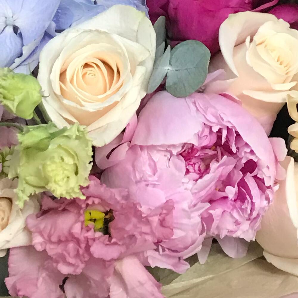 Гортензия – 1 шт.Гербера – 3 шт.Роза белая эквадор – 5 шт.Роза кустовая – 3 шт.эустома алиса пинк – 3 шт.Маттиола – 3 шт.Эвкалипт – 2 шт.пионы или пионовидные розы – 7 шт.Роза кустовая пионовидная – 3 шт.зелень декоративная – 3 шт.Упаковка дизайнерская – 1 шт.Лента атласная – 1 шт.