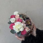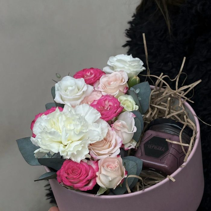 Романтичная коробочка со сладким крем-медом, кустовыми розами и диантусом.
