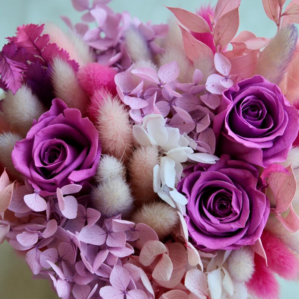 Роза одноголовая – 3 шт.Гортензия – 1 шт.пушистики – 1 шт.Керамическое кашпо – 1 шт.