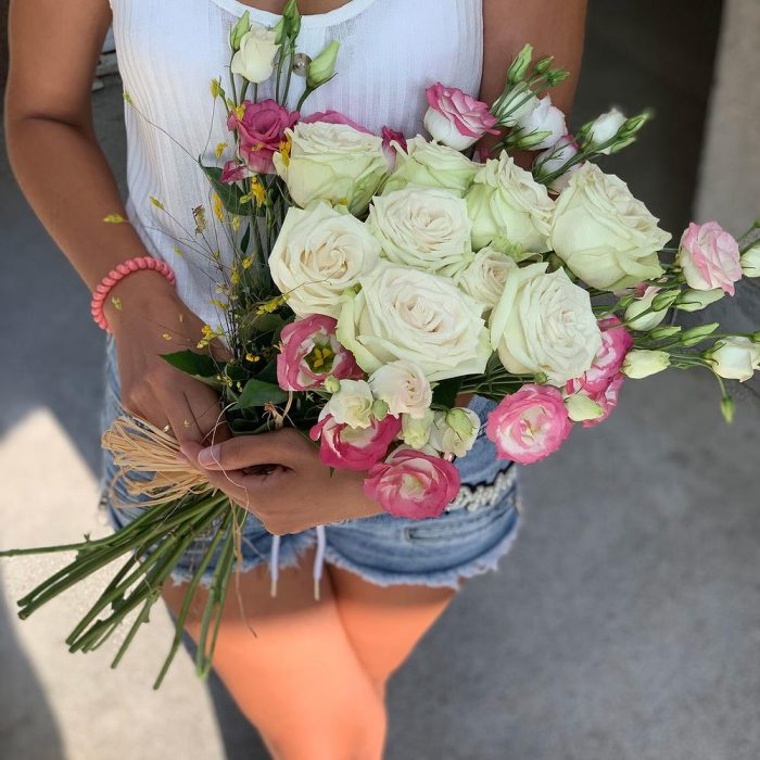 Букет из белых роз в сочетании с бело-розовой эустомой, перевязанный натуральной рафией.