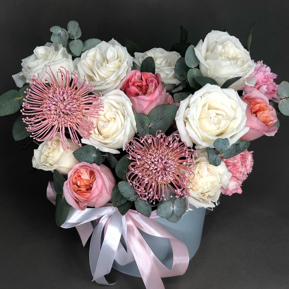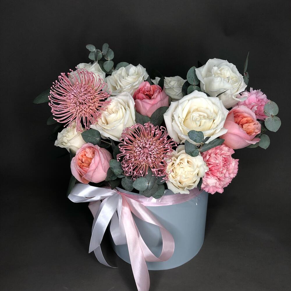 Огромная коробка с пионовидными розами и тропическими леукоспермумами. Когда хочется подарить не банальные розы