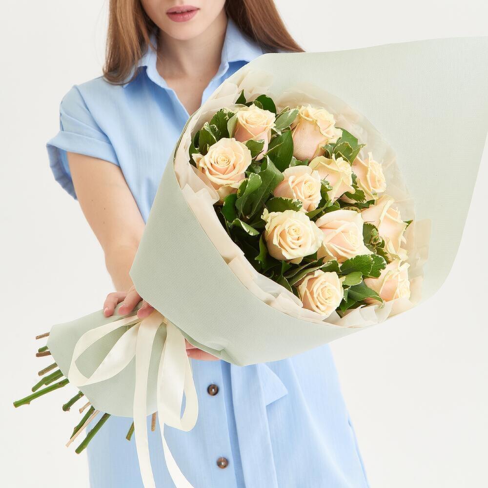 розы талея – 11 шт. Зелень – 5 шт. Открыточка с вашими пожеланиями – 1 шт. Упаковка дизайнерская – 2 шт.