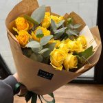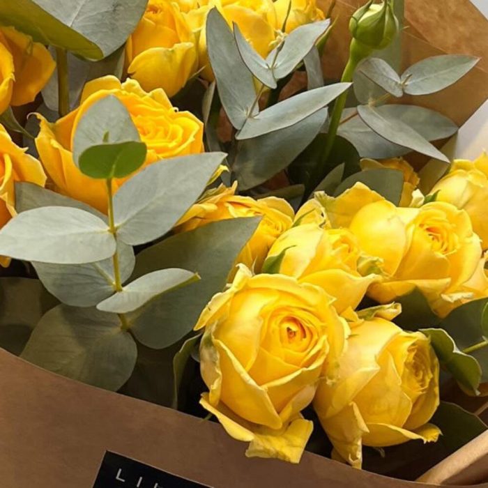 Упаковка дизайнерская – 1 шт. Открыточка с вашими пожеланиями – 1 шт. инструкция по уходу за цветами – 1 шт. желтые кустовые розы – 7 шт.