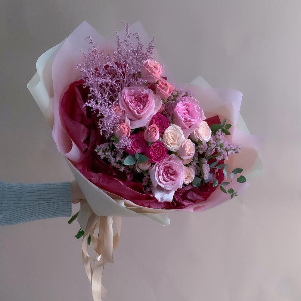 pink o’hara роза – 3 шт.Статица – 2 шт.Бомбастик роза – 1 шт.Роза кустовая – 2 шт.Солидаго – 1 шт.Эвкалипт – 3 шт.Упаковка дизайнерская – 1 шт.