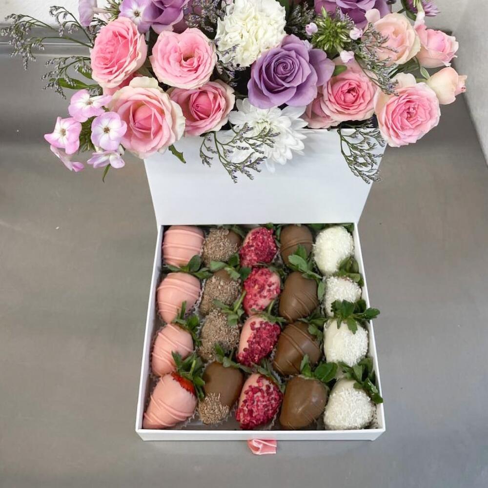 Шкатулка с цветами и клубникой в шоколаде «Розы микс»