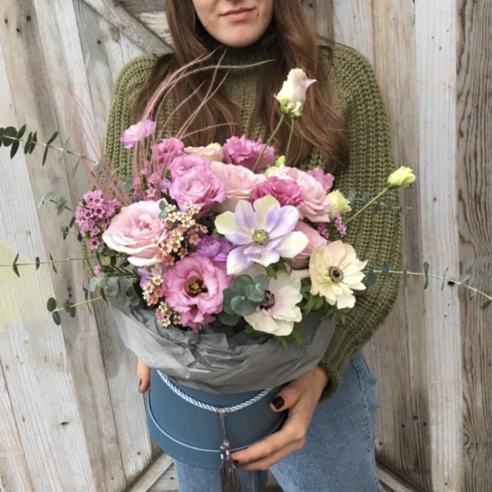 Шляпная коробка с анемонами, розами, лизиантусом, ваксфлауэром, ковылем и эвкалиптом.