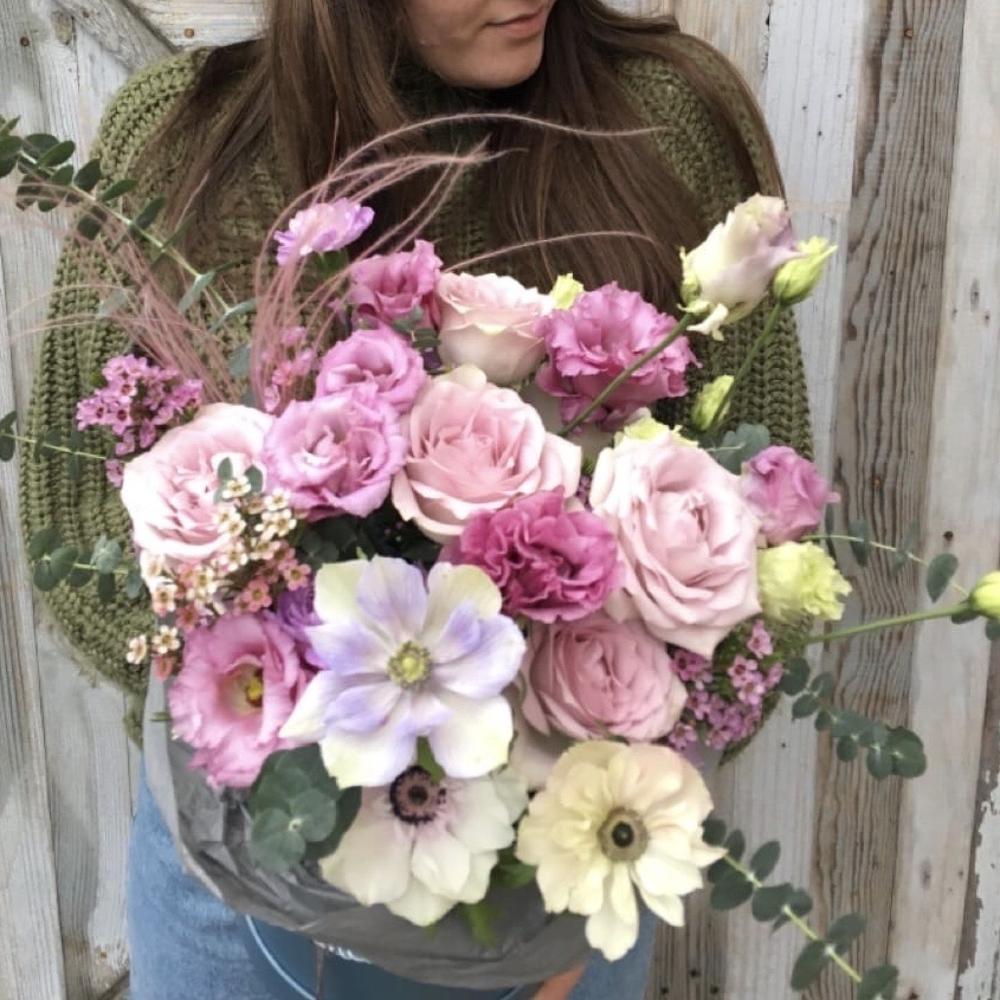 Маттиола – 3 шт.Роза – 7 шт.Лизиантус – 3 шт.Ваксфлауэр – 3 шт.Эвкалипт – 5 шт.Ковыль – 2 шт.Шляпная коробка – 1 шт.Тишью – 2 шт.Оазис – 1 шт.Анемон – 3 шт.