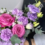 пион роза – 1 шт.Роза Эквадор – 2 шт.фиолетовая гвоздика – 3 шт.Маттиола – 1 шт.Лизиантус – 1 шт.Аллиум – 3 шт.Фисташка – 1 шт.Эвкалипт – 1 шт.Шляпная коробка – 1 шт.