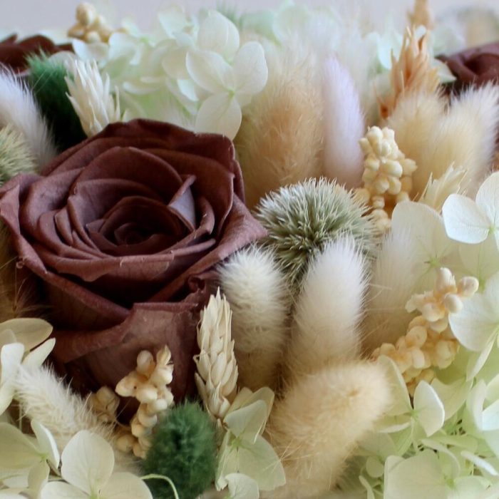 Роза одноголовая – 3 шт.Гортензия – 1 шт.пушистики – 1 шт.Колосья – 1 шт.Керамическое кашпо – 1 шт.