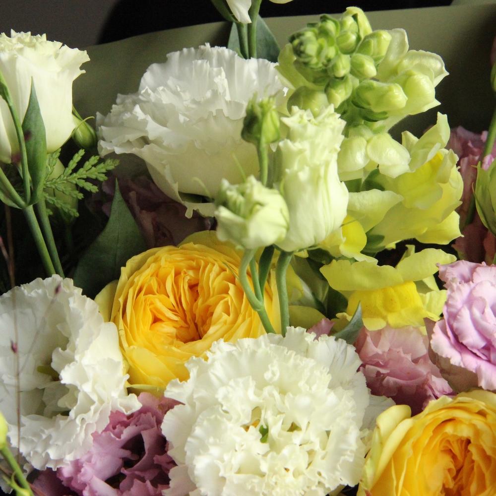 Солнечный, душистый букет с пионовидными розами, львиным зевом, туей, паникумом, лизиантусом и эвкалиптом.Стильное цветочное решение для любого случая.