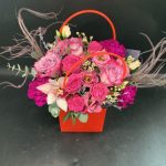 Цветы в коробке из пионовидных роз,Хризантемы и Гербер