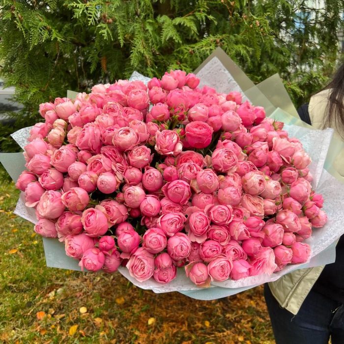 Лента атласная – 2 шт.Тишью – 4 шт.Роза пионовидная кустовая – 51 шт.Пленка матовая – 4 шт.