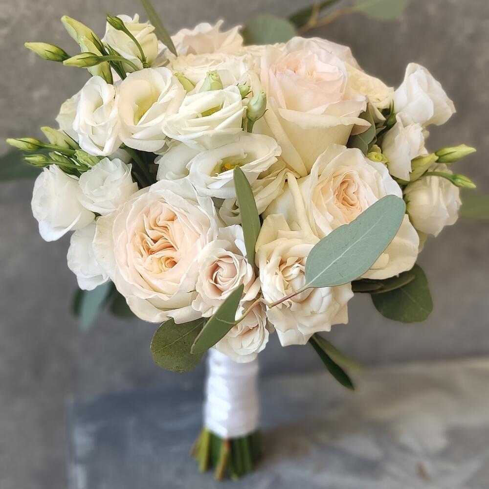 Лизиантус – 5 шт.Роза кустовая – 5 шт.Эвкалипт – 2 шт.Роза одноголовая – 5 шт.Лента атласная – 1 шт.