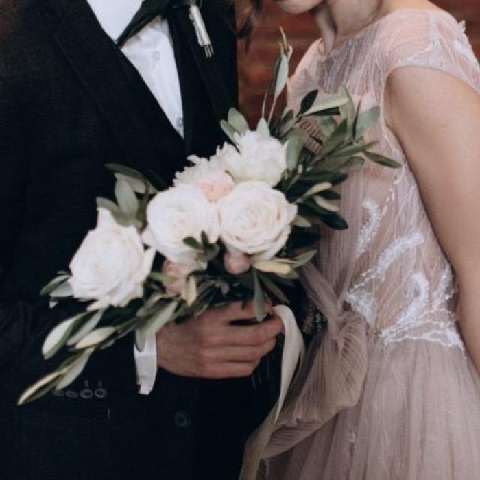 Свадебный бцкет ассиметричной, формы с обилием зелени веток оливы. Перевязан кожаными шнурками. Бутоньерка жениху в подарок!