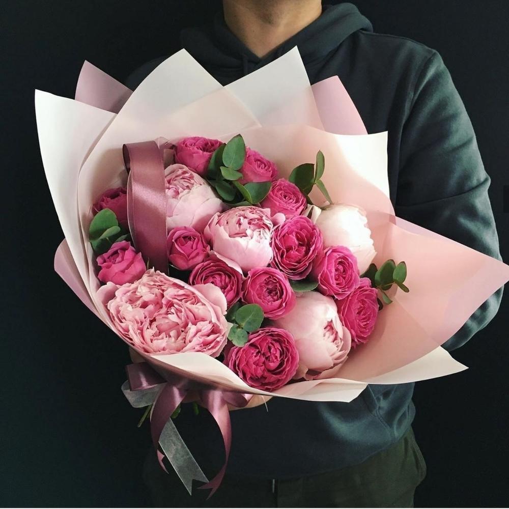 Пион – 5 шт.Роза кустовая – 7 шт.Упаковка – 1 шт.