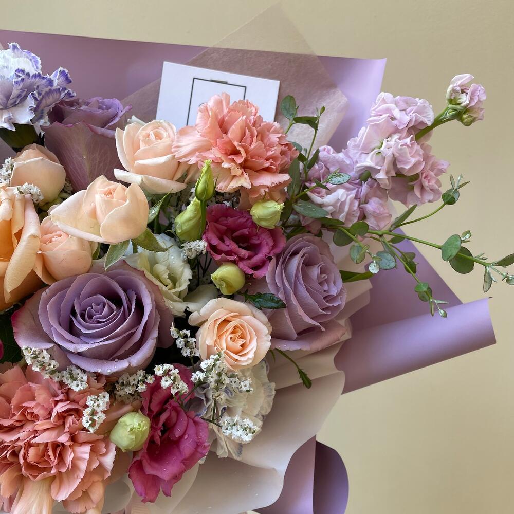 Маттиола – 1 шт.Папоротник – 1 шт.Роза кустовая – 1 шт.Эвкалипт – 1 шт.Диантус – 4 шт.Упаковка дизайнерская – 1 шт.Лимониум белый – 1 шт.Лизиантус Алиса белый – 1 шт.Лизиантус алиса розовый – 1 шт.Роза шиммер – 1 шт.роза грэй найтс – 3 шт.
