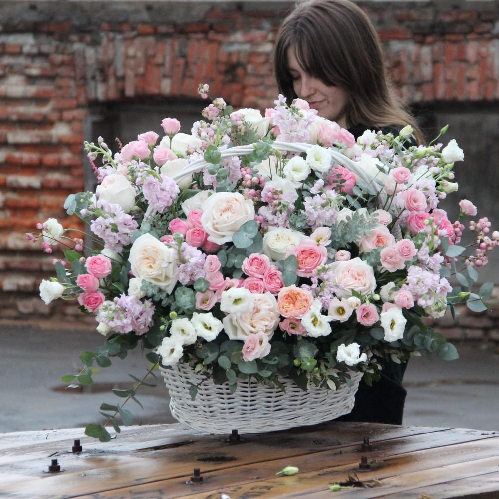 Корзина – 1 шт.Лизиантус – 25 шт.Маттиола – 20 шт.Эвкалипт – 11 шт.Оазис – 5 шт.Фисташка – 9 шт.Роза пионовидная – 35 шт.