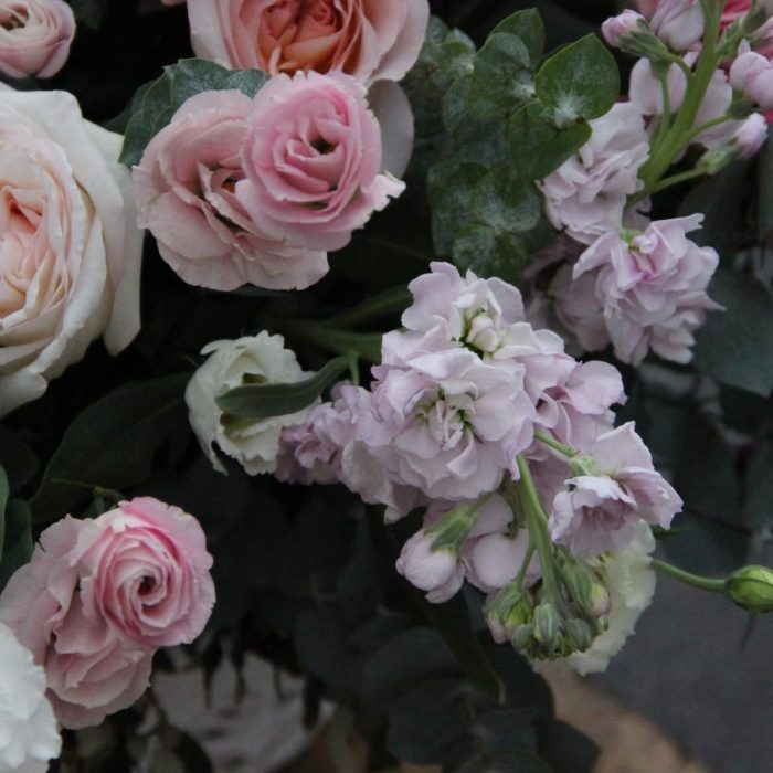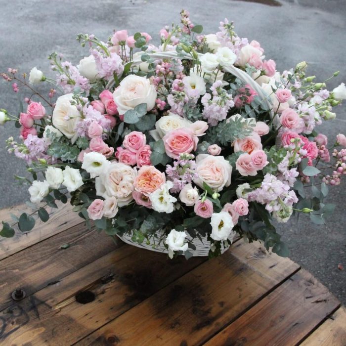 Зефирная – Корзина с пионовидными розами и маттиолой