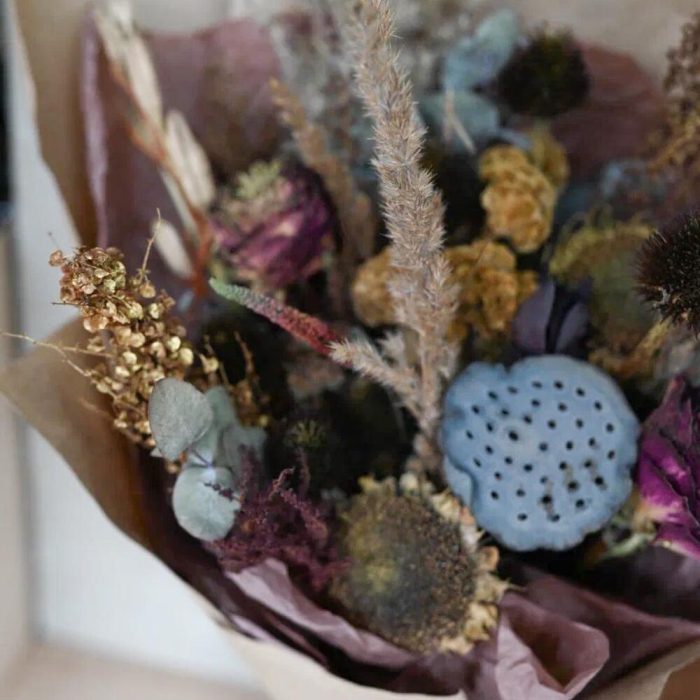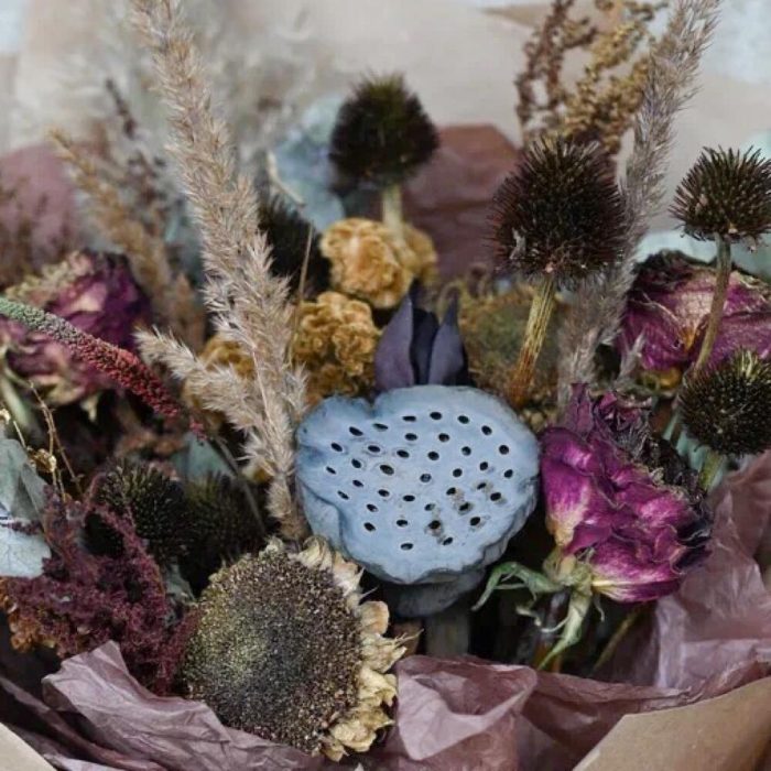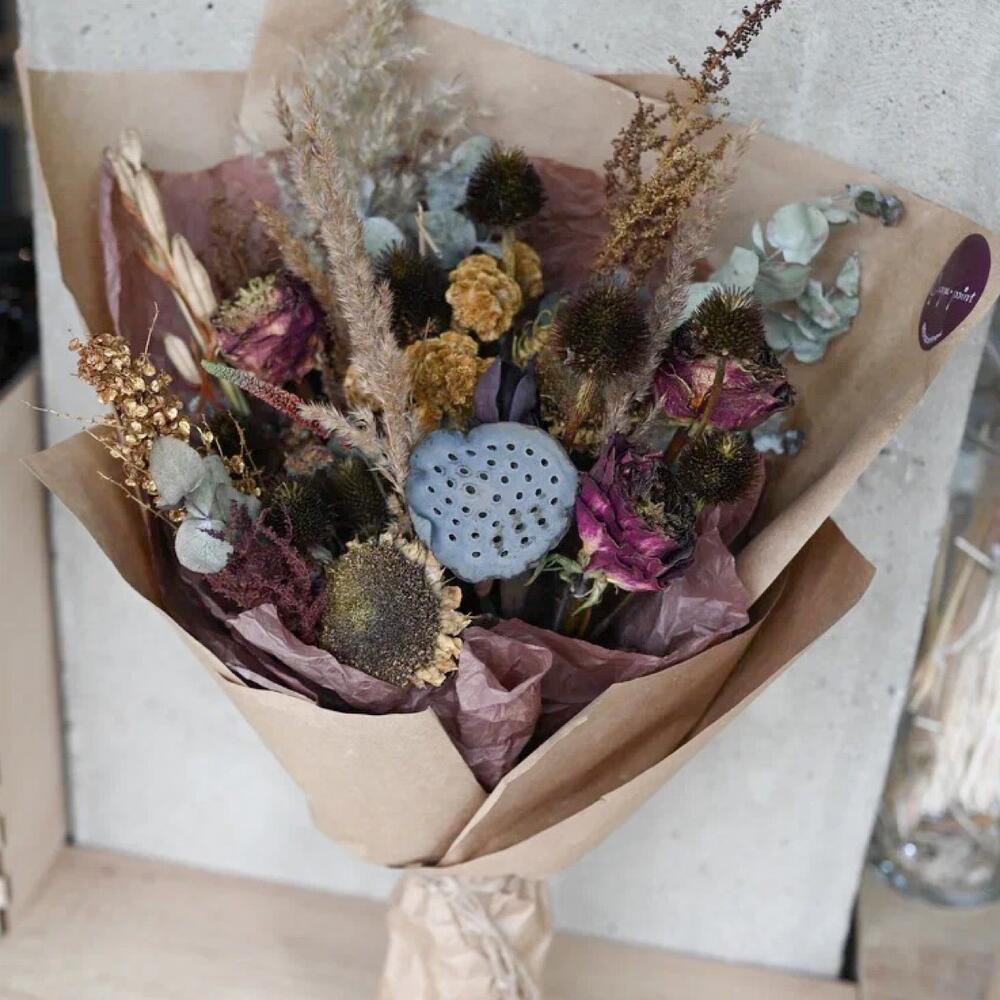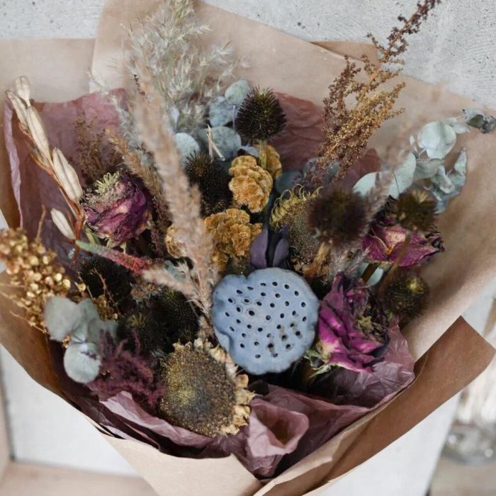 Астильба – 2 шт.Вероника – 1 шт.Целозия – 3 шт.Эвкалипт – 5 шт.Эрингиум – 3 шт.Сухоцветы – 5 шт.Упаковка дизайнерская – 1 шт.Нелумбо – 1 шт.Гелиантус – 2 шт.лекодендрон – 1 шт.розы – 3 шт.
