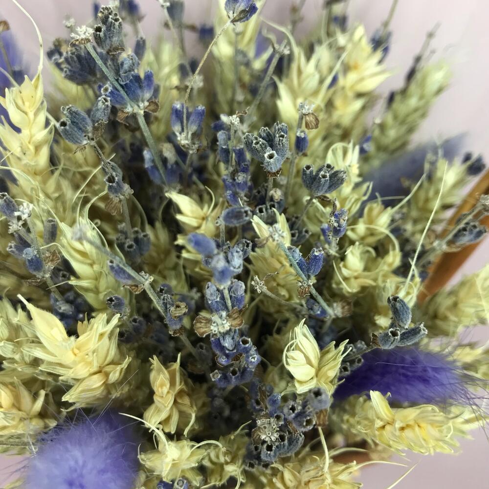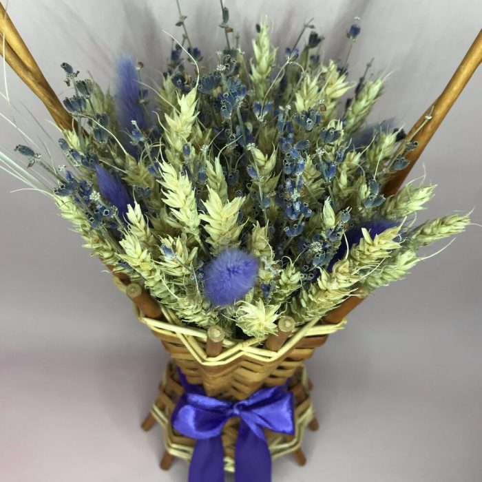 Лаванда (сухоцвет) – 100 шт.Пшеница (сухоцвет) – 100 шт.Лагурус (сухоцвет) – 6 шт.Корзина плетеная – 1 шт.Лента атласная – 1 шт.