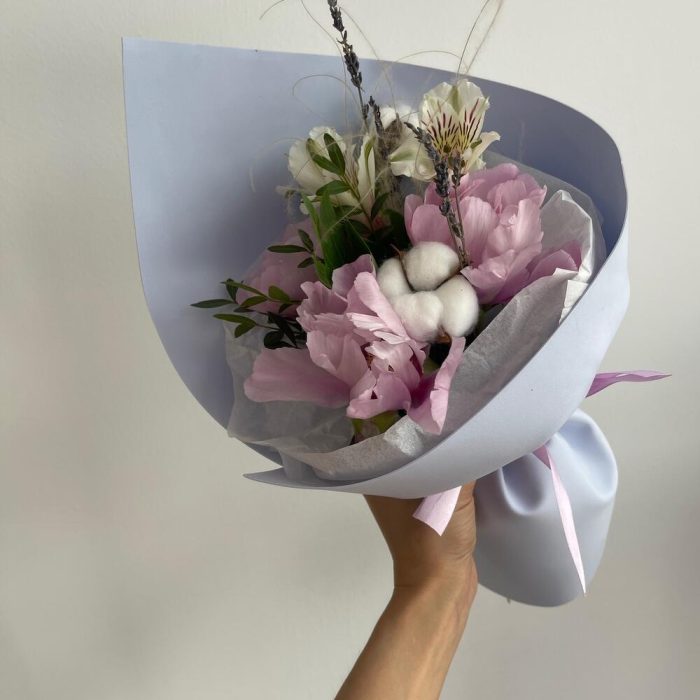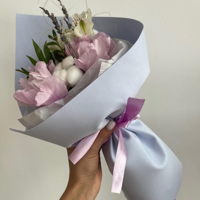Лаванда – 5 шт.Пион – 3 шт.Хлопок – 2 шт.Стифа – 1 шт.Фоамиран (упаковка) – 1 шт.Альстромерия – 1 шт.