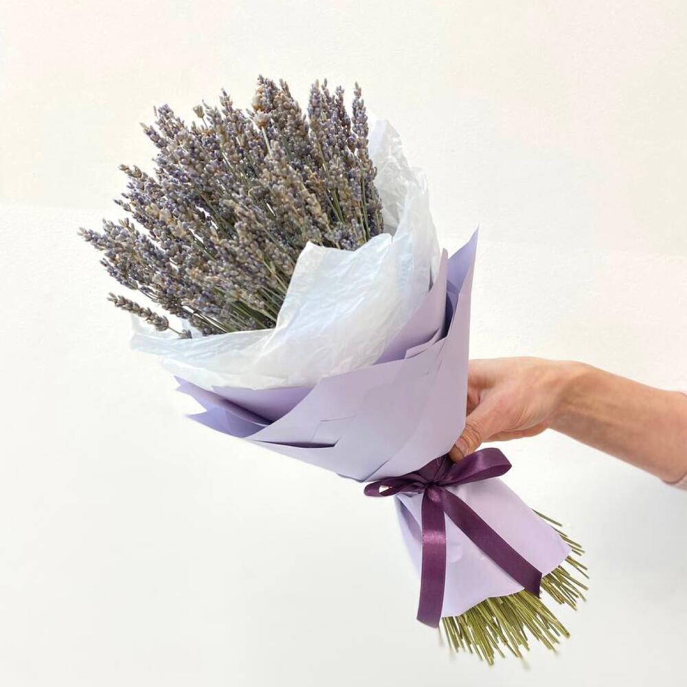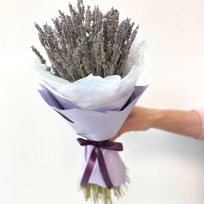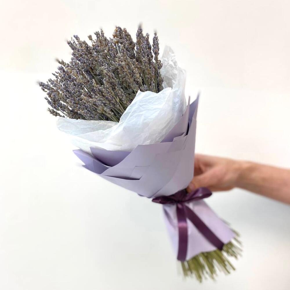 Лаванда (сухоцвет) – 65 шт.Бумага – 1 шт.Тишью белое – 1 шт.Лента атласная – 1 шт.