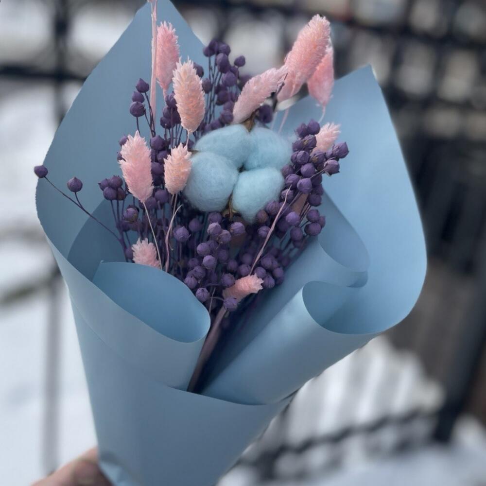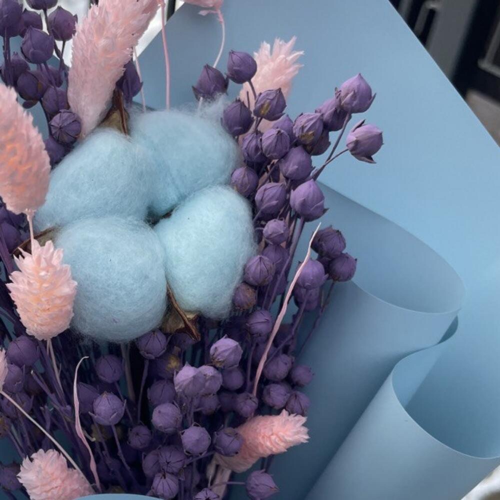 Хлопок натуральный – 1 шт.лëн сухоцвет – 25 шт.Фаларис – 12 шт.Упаковка дизайнерская – 3 шт.Лента атласная – 1 шт.