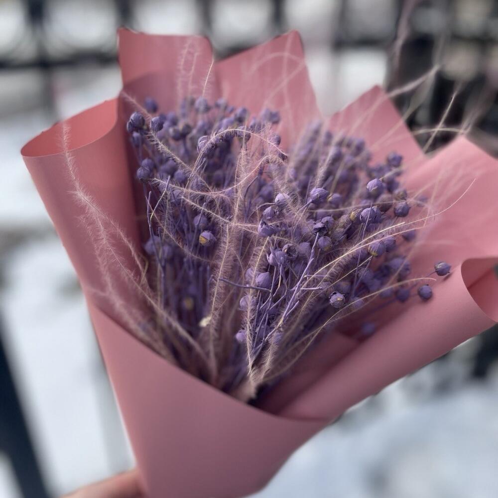 лëн сухоцвет – 10 шт.Ковыль – 9 шт.Упаковка дизайнерская – 4 шт.Лента атласная – 1 шт.
