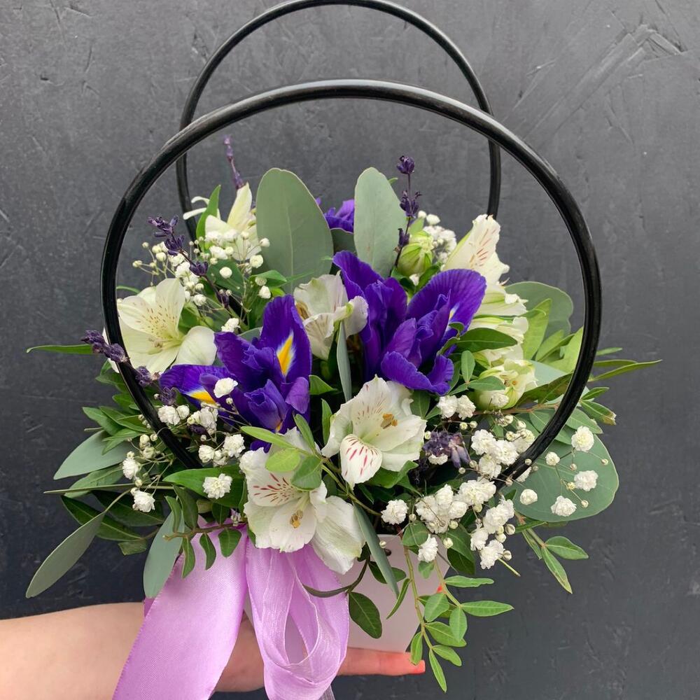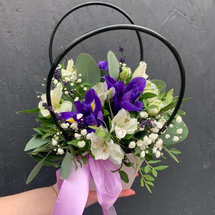 Ирис – 3 шт.Альстромерия – 3 шт.Гипсофила – 1 шт.Лаванда (сухоцвет) – 7 шт.Фисташка – 3 шт.Эвкалипт – 4 шт.Сумочка картонная – 1 шт.Оазис флористический – 1 шт.Лента атласная – 2 шт.