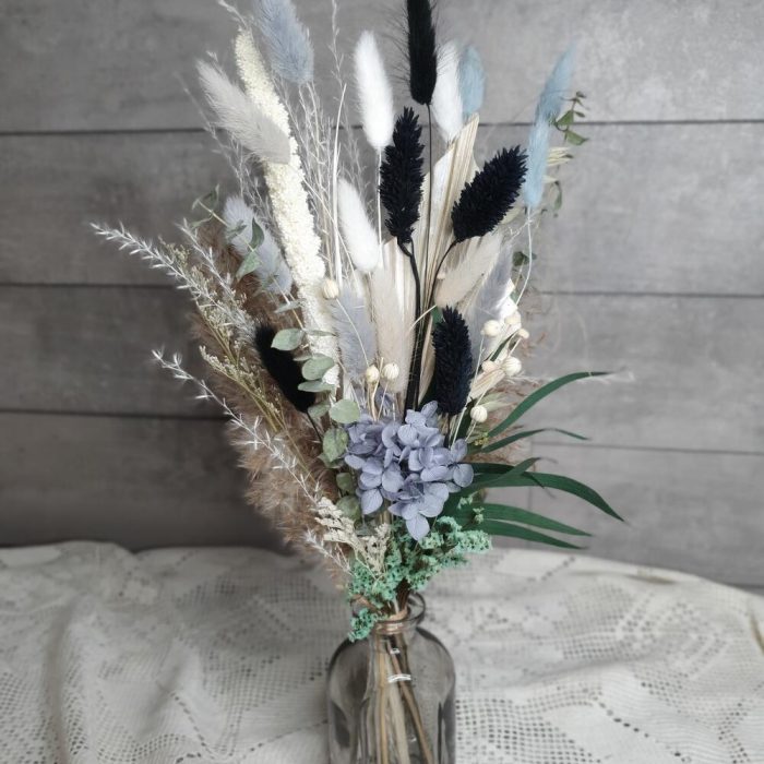 гортензия стабилизированная пучок – 1 шт.мини пампас – 1 шт.ботао – 3 шт.сетария сухоцвет – 1 шт.камыш декоративный – 1 шт.стабилизированный эвкалипт – 1 шт.Эвкалипт сухоцвет – 3 шт.Лагурус – 10 шт.Фаларис – 4 шт.копье пальмы – 1 шт.лен сухоцвет – 1 шт.аурея белая – 1 шт.статица стабилизированная – 1 шт.Ваза стеклянная – 1 шт.