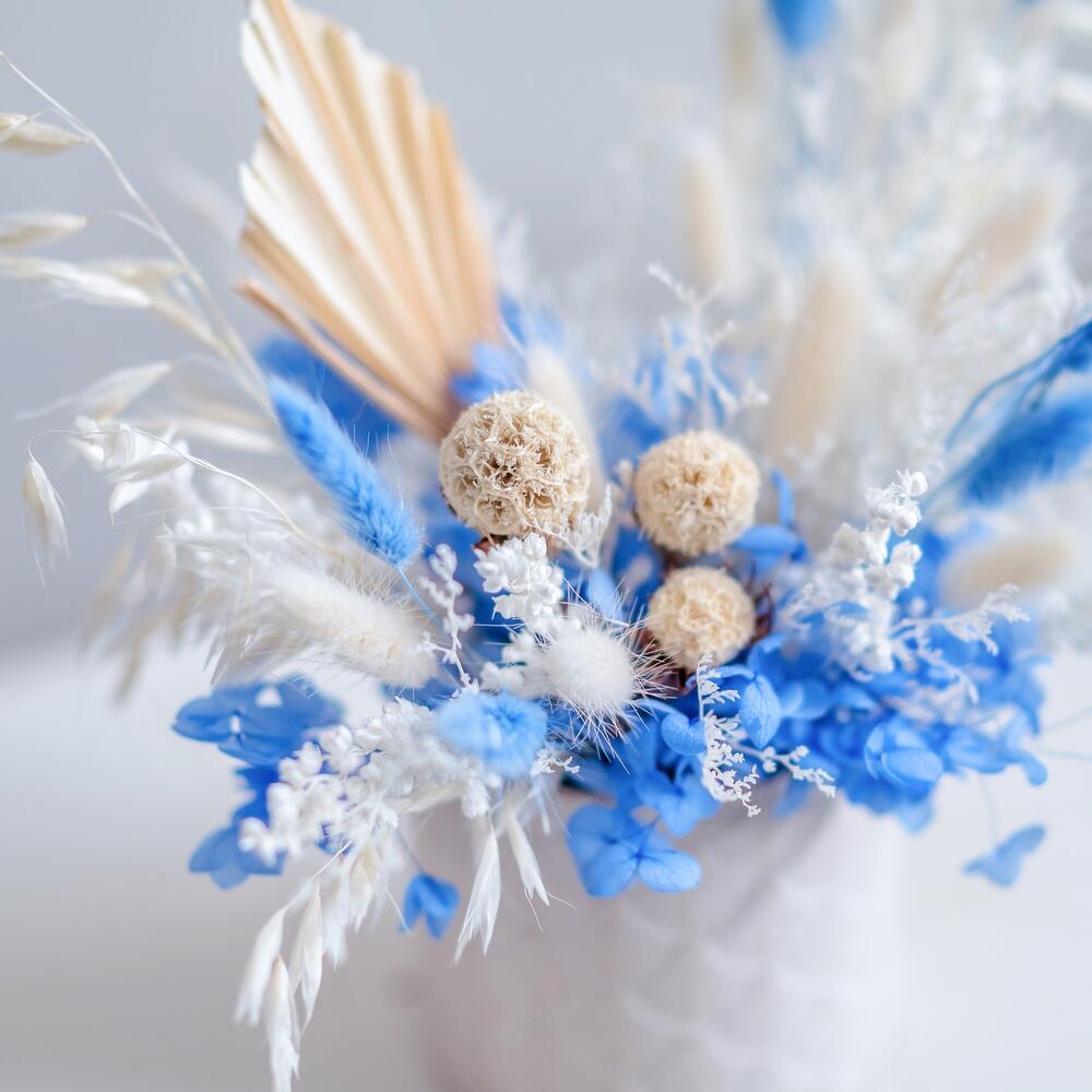 Скабиоза – 3 шт.Лагурус – 2 шт.Кашпо керамическое – 1 шт.Лист пальмы – 1 шт.Дизайнерская упаковка – 1 шт.гортензия стабилизированная – 1 шт.сорго – 1 шт.мох ягель стабилизированный – 1 шт.лимониум стабилизированный – 1 шт.дикий овес – 1 шт.