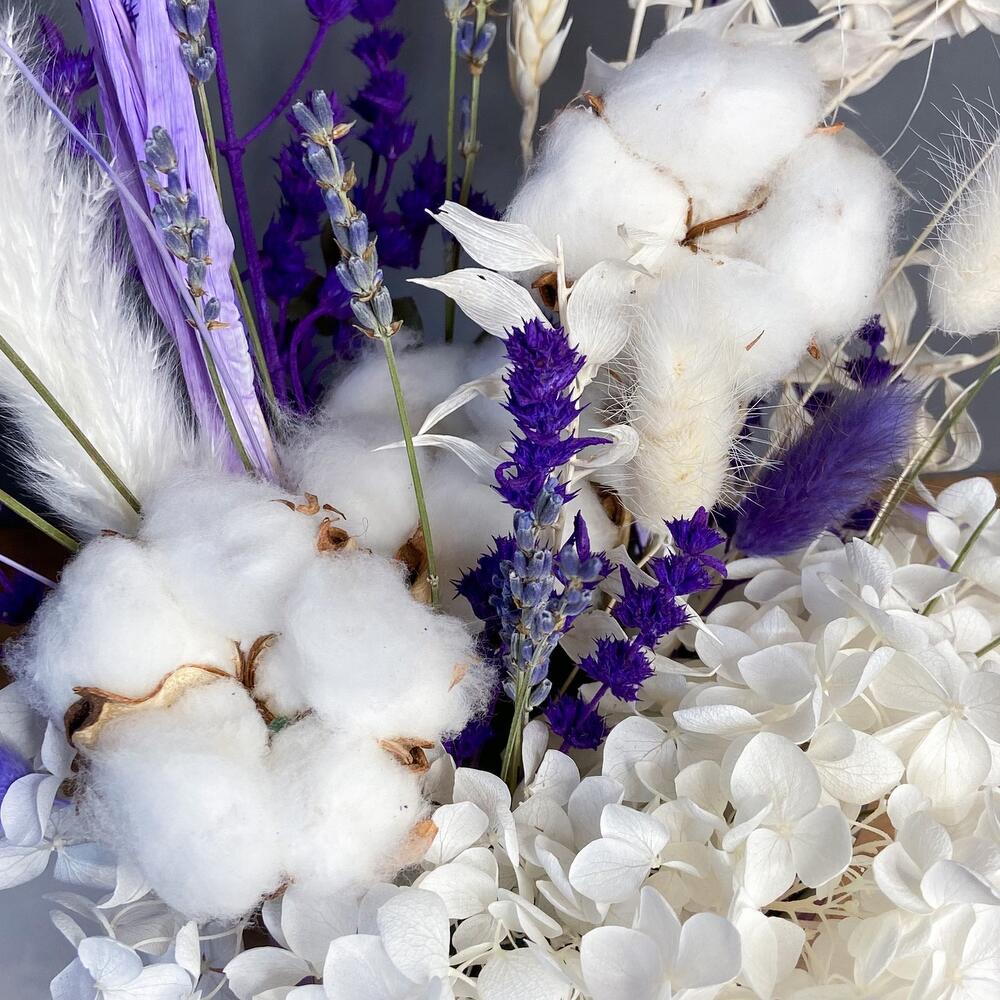 «Лавандовое созвездие» Букет из розы, гвоздики, статица и хлопка