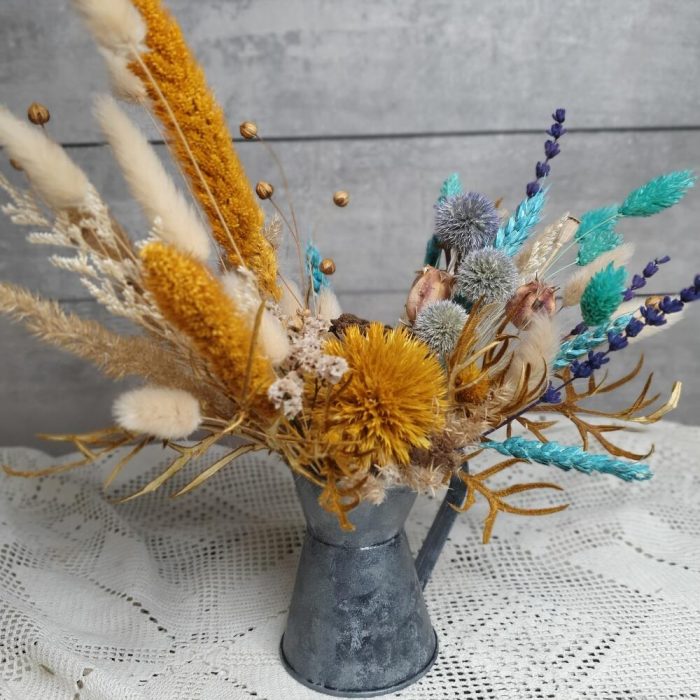 Эхинопс – 4 шт.Фаларис – 4 шт.Сетария – 3 шт.Лагурус (сухоцвет) – 10 шт.Лимониум – 1 шт.Лен – 2 шт.маковые коробочки сухоцвет – 2 шт.вейник пучок – 1 шт.стабилизированная лаванда – 3 шт.Колоски – 4 шт.стабилизированная статица – 1 шт.кашпо кувшин металическая – 1 шт.