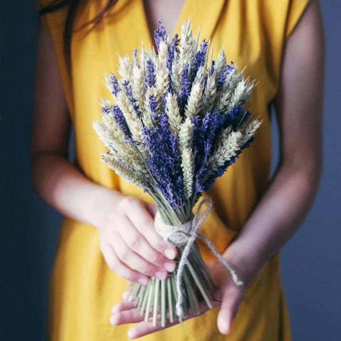 Лаванда (сухоцвет) – 85 шт.Лента – 1 шт.Пшеница (сухоцвет) – 15 шт.