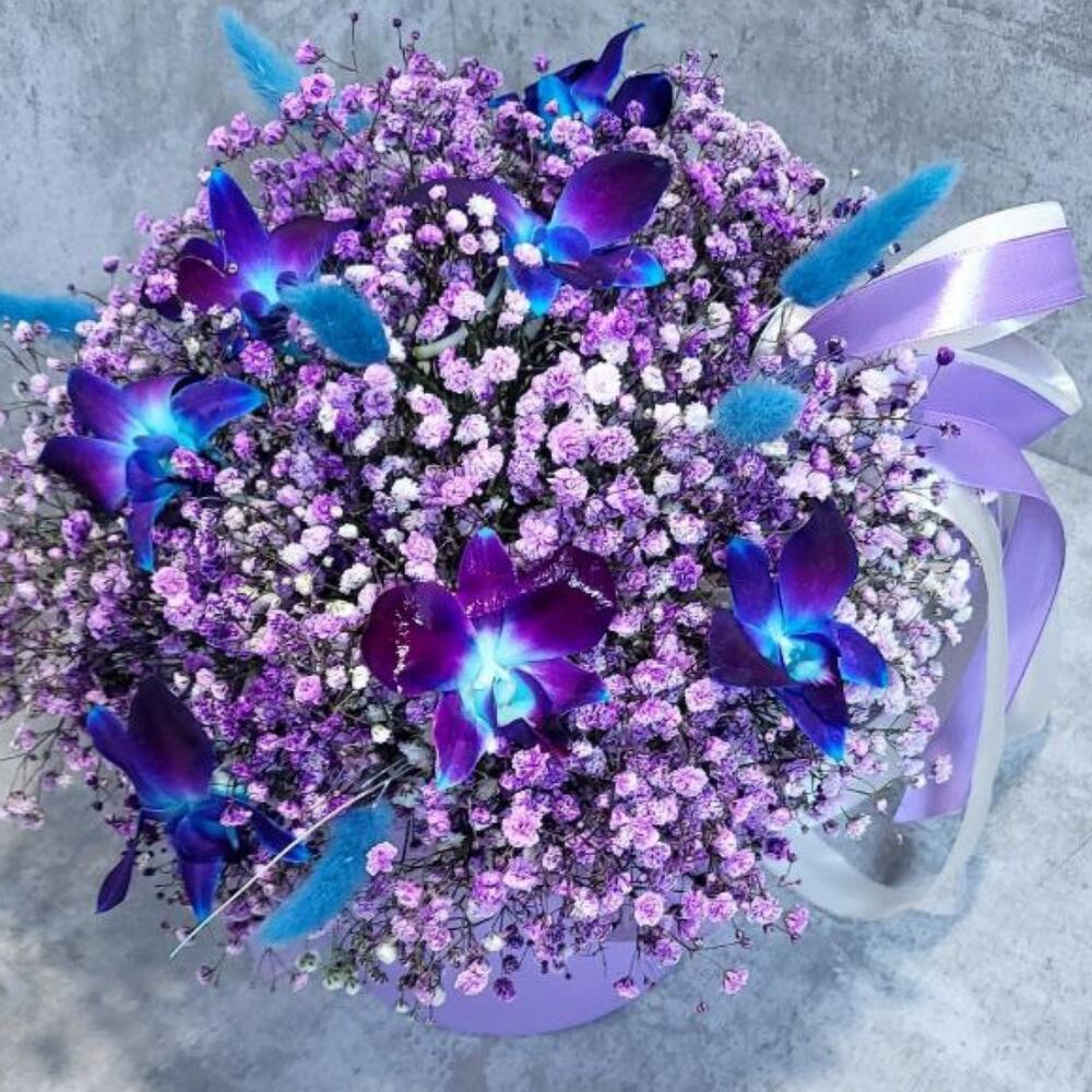 Гипсофила – 6 шт.Орхидея Дендробиум – 8 шт.Шляпная коробка – 1 шт.Лагурус – 7 шт.Оазис флористический – 1 шт.