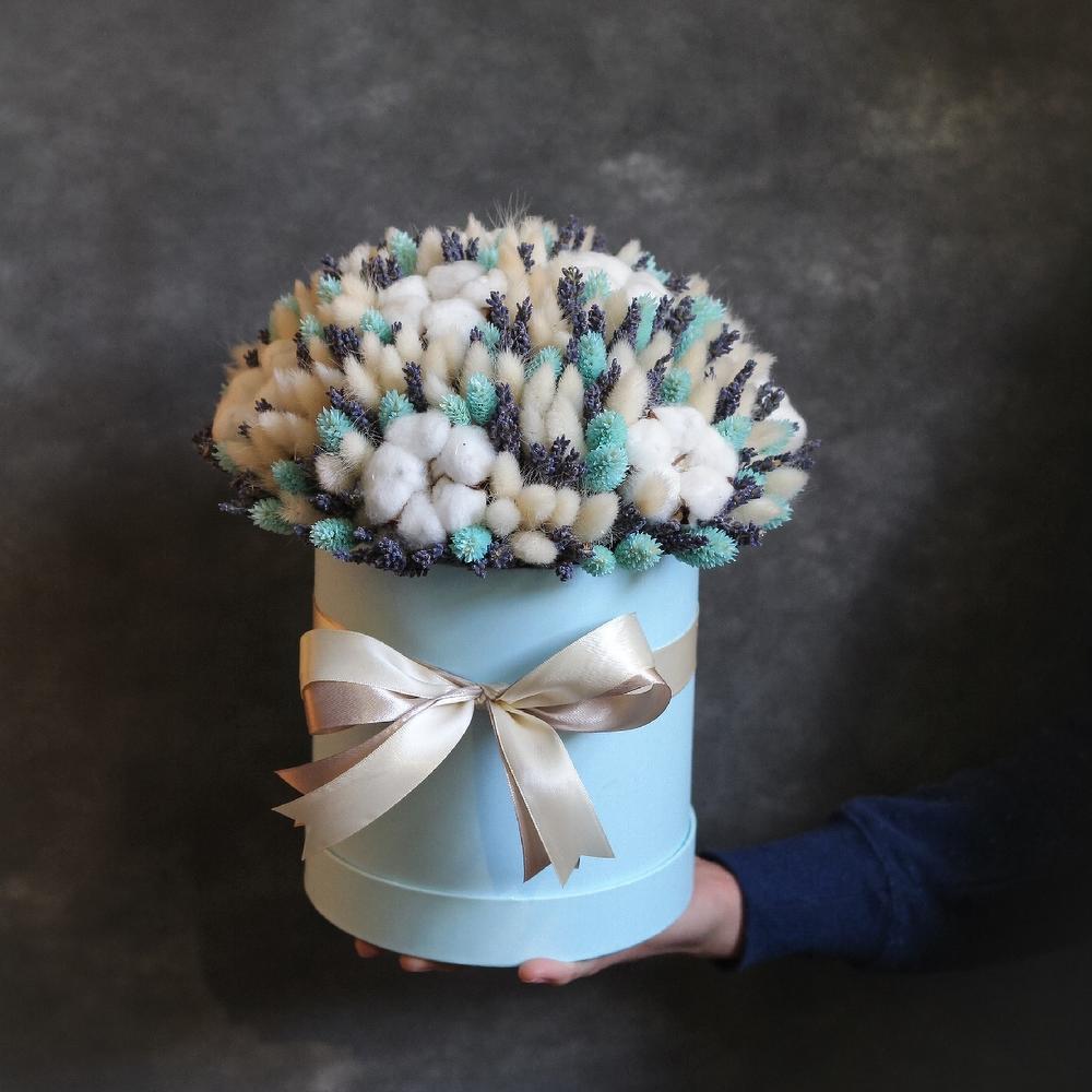Лагурус (сухоцвет) – 77 шт.Лаванда – 33 шт.Хлопок натуральный – 5 шт.Коробка шляпная – 1 шт.Лента атласная – 1 шт.Оазис флористический – 1 шт.