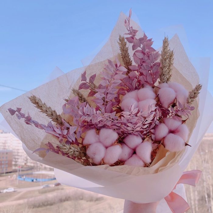 Лента атласная – 1 шт.Колоски – 10 шт.Упаковка дизайнерская – 1 шт.Инструкция по уходу – 1 шт.хлопок розовый – 5 шт.рускус сухоцвет крашенный – 2 шт.