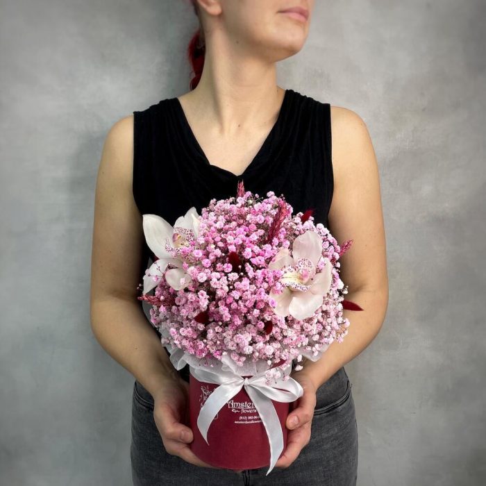 Орхидея Цимбидиум – 3 шт.Оазис – 1 шт.Лагурус – 11 шт.Коробка d12 – 1 шт.Гипсофила розовая – 7 шт.