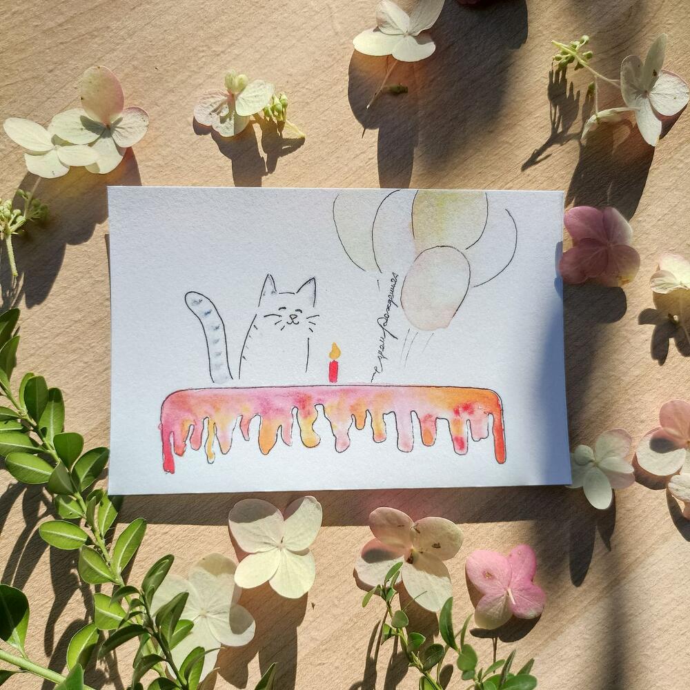 Открытка Кот с тортом "С днём рождения!" 10*15