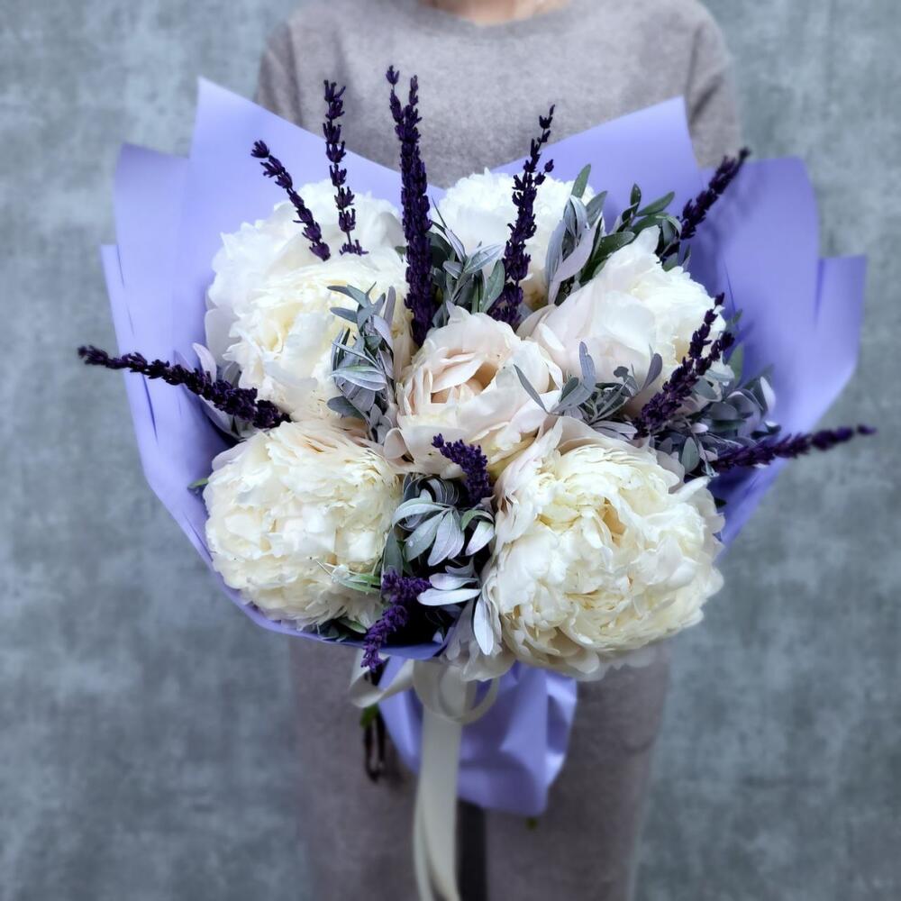 Авторский букет из пионовидных роз, оксипеталум и астильба «Очарование»