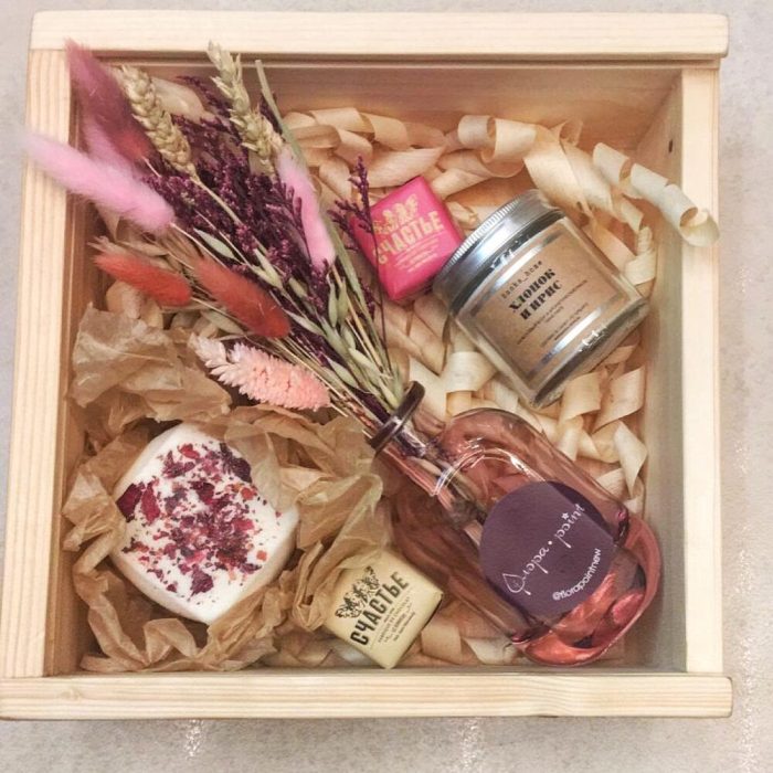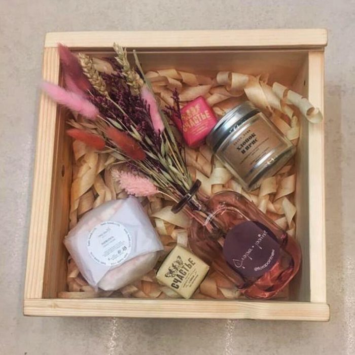Ваза стекло – 1 шт.Ящик деревянный – 1 шт.конфеты счастье – 2 шт.букет сухоцветов – 1 шт.свеча банка home – 1 шт.бомбочка из натуральных масел для ванной – 1 шт.