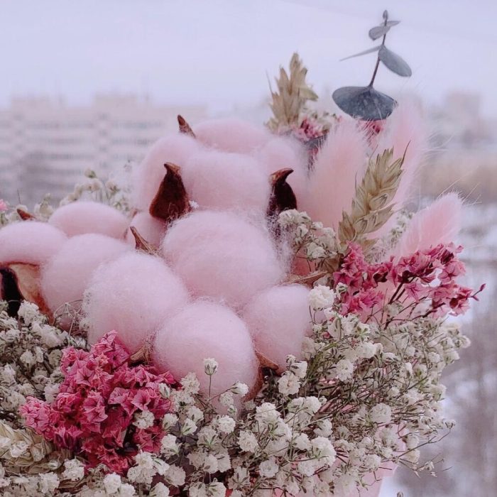 Лимониум – 2 шт.Хлопок – 3 шт.Эвкалипт – 1 шт.Колоски – 6 шт.Кашпо керамическое – 1 шт.Лагурус (сухоцвет) – 5 шт.гипсофила сухоцвет – 2 шт.