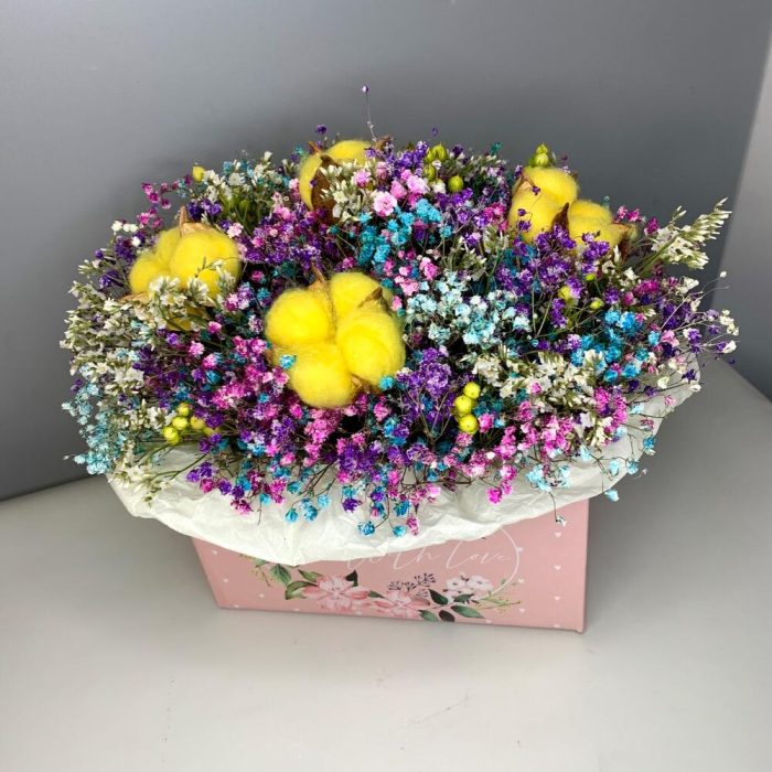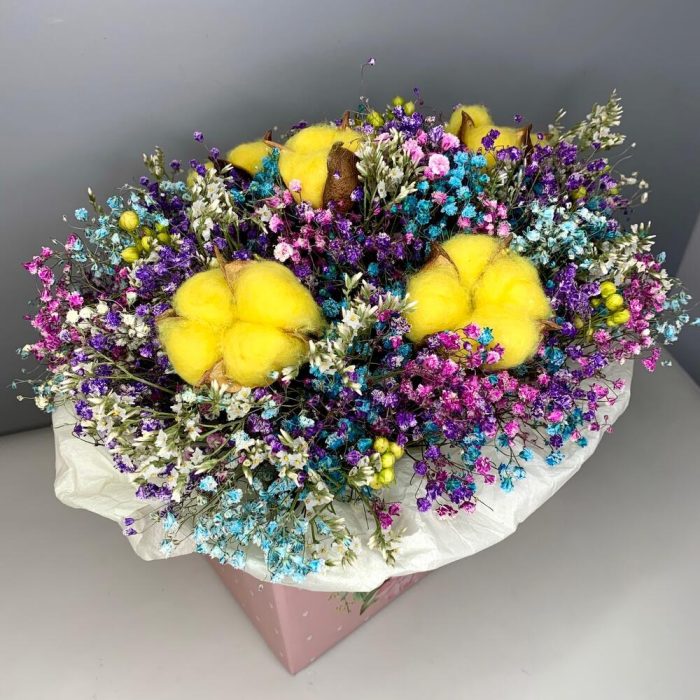 гипсофила сухоцвет – 10 шт.лимониум сухоцвет – 5 шт.Хлопок – 5 шт.абрус сухоцвет – 5 шт.Коробка – 1 шт.Оазис флористический – 1 шт.Тишью – 2 шт.Пленка прозрачная – 1 шт.Лента атласная – 2 шт.