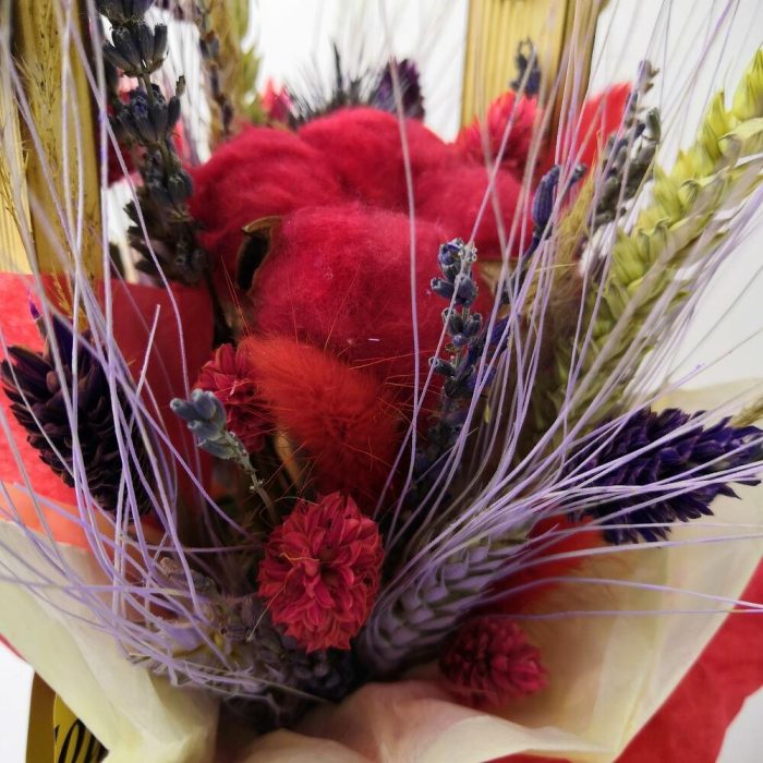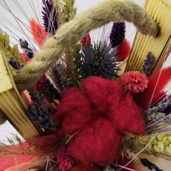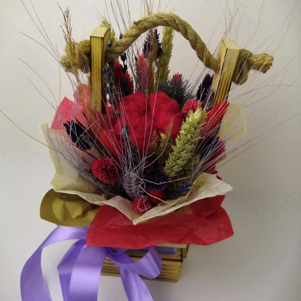 Лагурус – 19 шт.Хлопок – 1 шт.Лаванда (сухоцвет) – 11 шт.Пшеница (сухоцвет) – 8 шт.Тишью – 1 шт.Ящик – 1 шт.Лента атласная – 1 шт.Оазис – 1 шт.