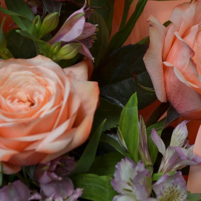 пионовидные розы – 5 шт.Альстромерия – 6 шт.Лагурус – 7 шт.стильная упаковка букета – 1 шт.