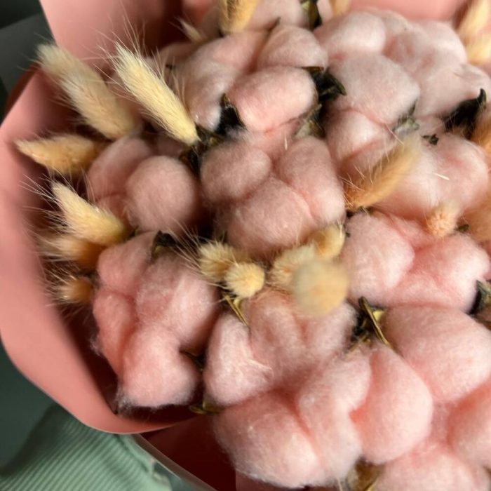 Хлопок натуральный – 15 шт.Лагурус (сухоцвет) – 40 шт.Упаковка дизайнерская – 5 шт.Лента атласная – 1 шт.