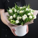 31 белый пионовидный тюльпан в шляпной коробке