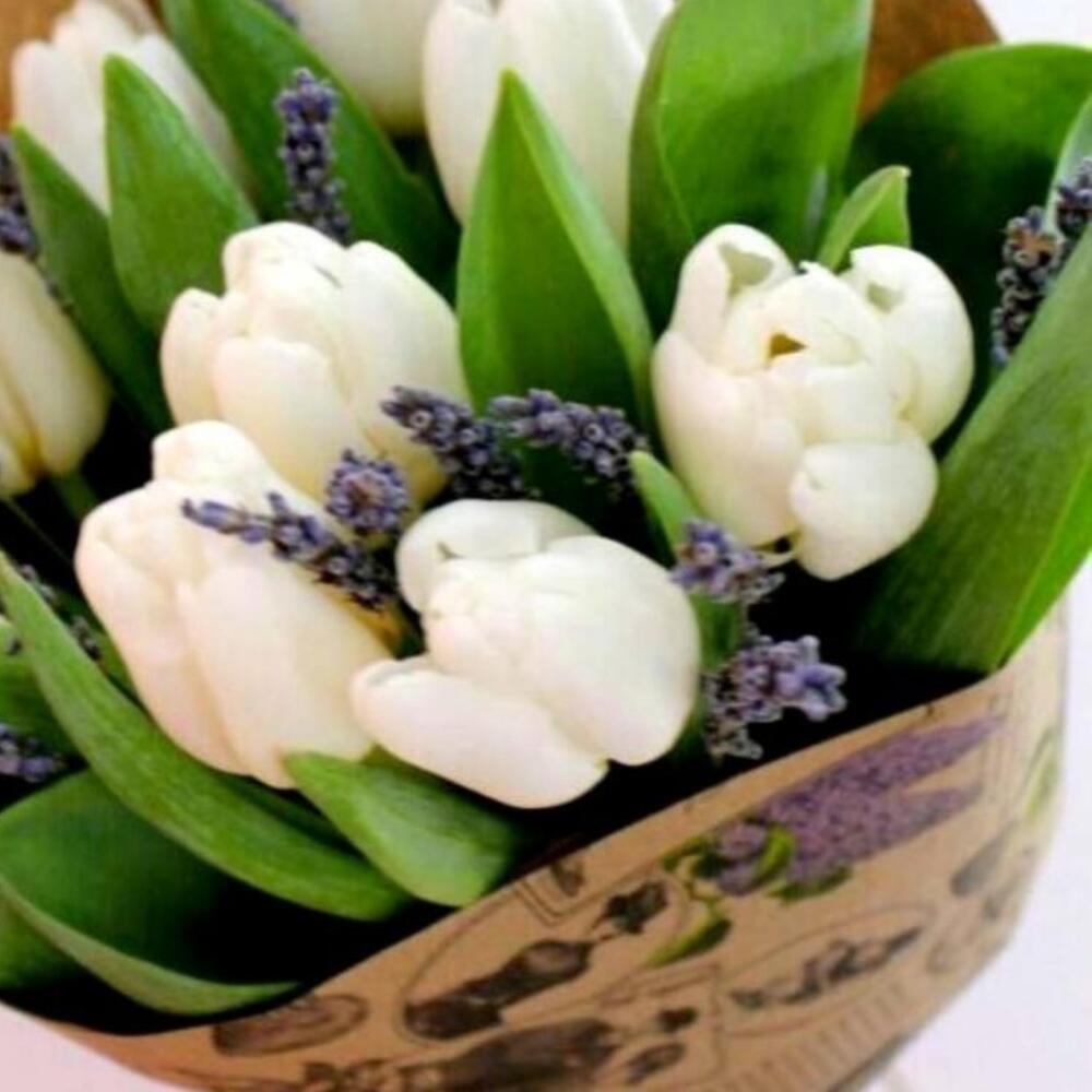 Белые тюльпаны с лавандой в крафте
