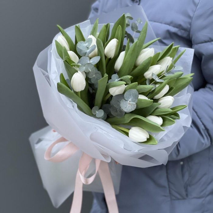 Букет из белых тюльпанов и эвкалипта в оформлении!